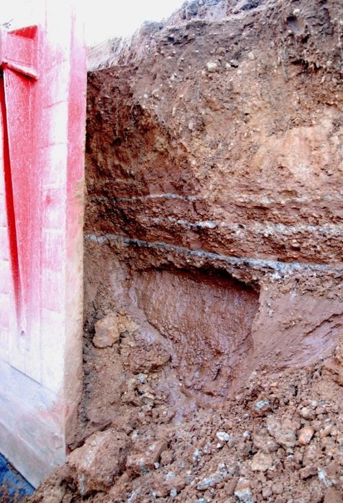 06. Avon Valley Formation Pershore Member, February Piece, Pershore, Worcestershire, 8 April 2014. Quartzose sand unit resting on Charmouth Mudstone. North face of pipe trench close to B in 02.