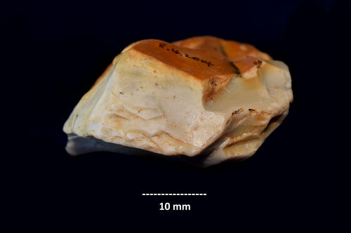 The second artefact is a concave scraper worked on Jurassic fine-grained micaceous siltstone (12a, 12b) found ex situ close to the contact of the gravel and bedrock. The siltstone is uniformly laminar, some four millimetres thick with its long-edge facetted by man; this allows it to rest easily between the index finger and a platform created by another finger of the same hand. Jurassic micaceous siltstones and ironstone were observed near or close to the contact of the sands and gravels with the underlying Charmouth Mudstone. Neanderthal man evidently found that brittle Jurassic siltstone constituted an acceptable resource which is suggestive of local human presence.
