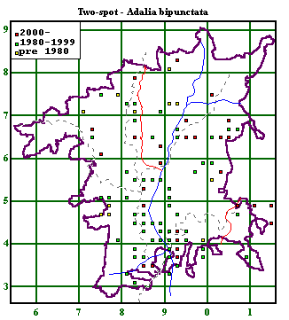 Common. Unlike the 7 spot, there are several different colour forms of this species The commonest variant is black with four irregular red spots