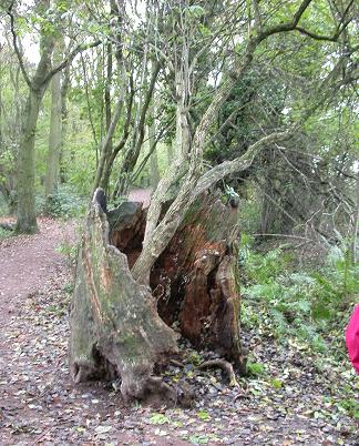 Remains of an ancient oak at the edge of Nunnery Wood, with elder growing from the decayed centre. Picture G H Green |