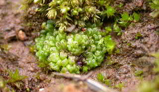 | The rare virtually leafless but fruiting Buxbaumia ophylla at British Camp | A close-up |