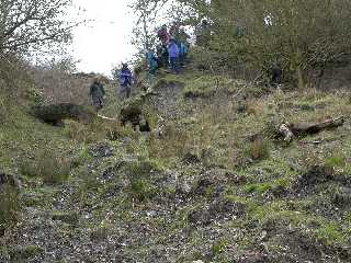 | Bryologists descend the famous mud slip in Bredon Hill NNR | Bryologists gather in a sheltered hollow on the summit of Bredon Hill for lunch. Photo Harry Green |