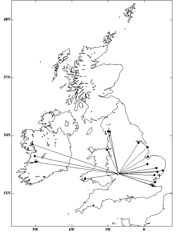 Map showing ringing recoveries in Europe of wigeon associated with Bredons Hardwick, near Tewkesbury. The lines link site of ringing and recovery and do not of course necessarily show the actual route used by the birds, particularly in cases when ringing and recovery are in different years.