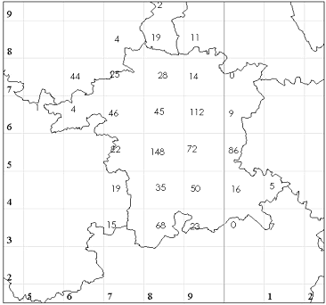 Distribution of ancient trees recorded in the Worcestershire Register in 10 km squares of national grid.