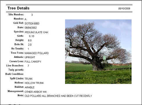 This project has been running for five years in that time we have written a customised database system. The system holds data such as girth and height, digital photograph and the position of each tree is marked on an aerial photograph. To date we have recorded 932 trees on 177 sites. 42 People have recorded trees.