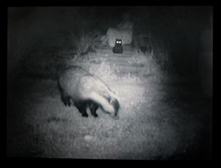 We have continued to feed badgers and foxes throughout the year, gradually moving the food up the garden to a more convenient spot. I have gradually got the animals used to a 500 watt light so we can now sit on the steps (from where the animals cannot scent us so readily), just 8 feet away and watch the action by the light of the spotlight (see picture)! The extra light is useful for focussing a still camera too