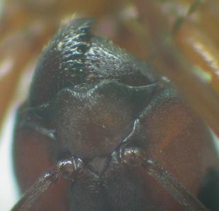 | The two pictures above by Harry Green show the characteristic clypeal notch of Formica sanguinea which distinguishes the species Formica rufa from the commoner Wood Ant . This is a tricky character to use in the field when examining live ants as shown in the picture below right by Rosemary Winnall | |