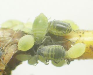 | Aphids on Argyron repens stolons beneath the hive. Probably Anoecia corni - see text | |