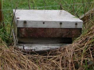 | The old bee hive amongst tall grass | The ant nest carton near the top of the frames with an old honeycomb inside. | |