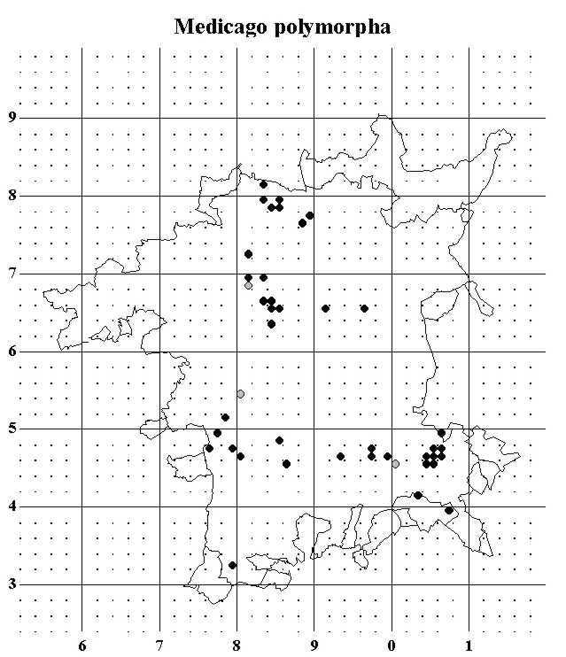 The distribution of Toothed Medick Medicago polymorpha is difficult to interpret. At first glance it might be thought that it is a scarce native of river terrace soils but it is almost certainly not native in the county. The true explanation for its distribution requires a knowledge of past cultivation practices. It probably arrived with wool shoddy, which was once used to improve low fertility soils. The map mainly shows where wool shoddy was used in the county.