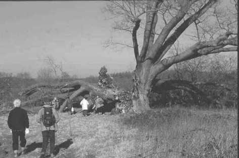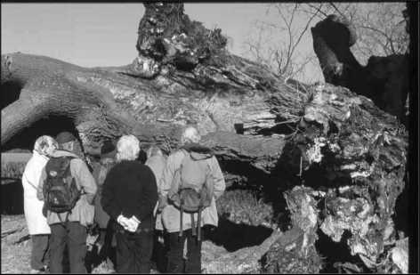 Amongst recent discoveries are a series of ancient ash trees on the eastern end of Bredon Hill, oaks in Malvern, ancient lime trees in several woods in west Worcestershire, and ash trees in the Teme valley. The Wyre Forest Study Group enjoyed an excellent day (15th February 2003) looking at old trees in that area. These included great oaks at Ribbesford, an enormous sweet chestnut in Bewdley, a surprising black poplar hidden in a dingle valley, some very large maiden oaks just over the border into Staffordshire at Birchen Park, and the stricken Mawley Oak (See Worcestershire Record No 12 April 2002 for details). The owners kindly allowed the Group to look closely at the Mawley Oak and the following notes were made: